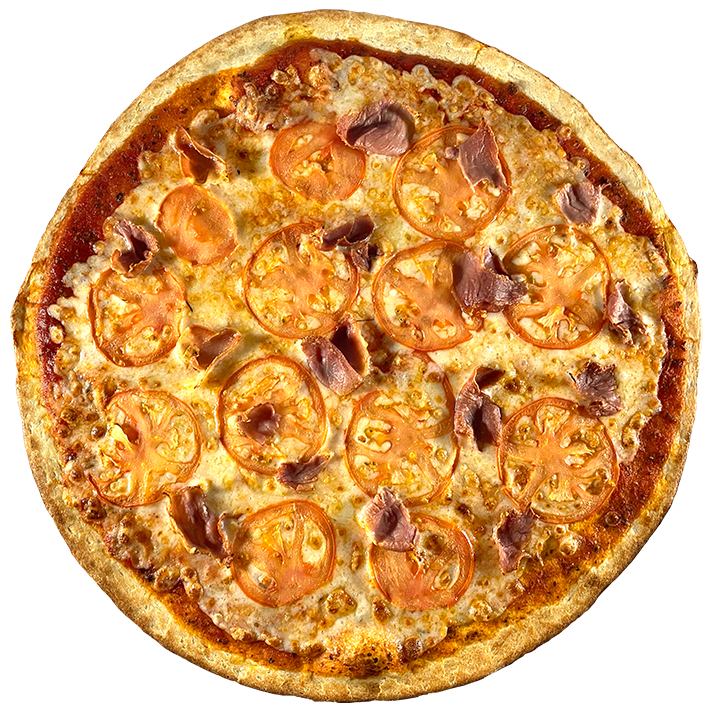 Pizza de jamón serrano de alta calidad acompañada de frescas rodajas de tomate natural cortado al momento