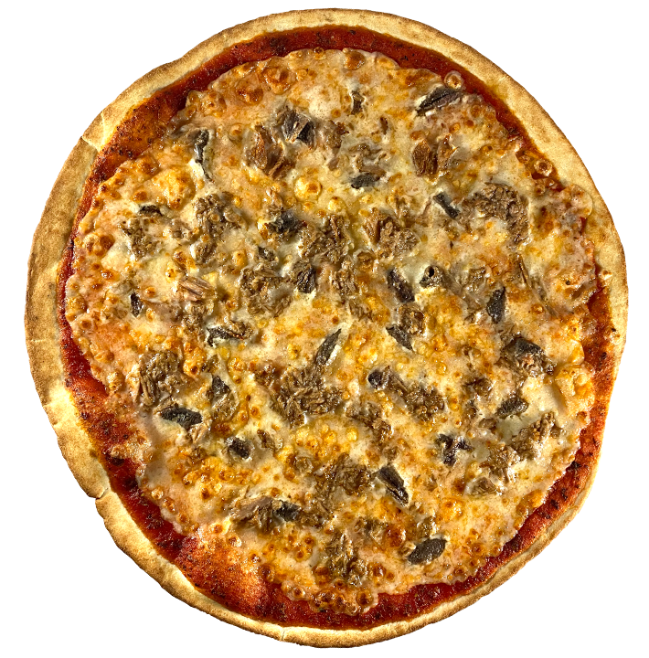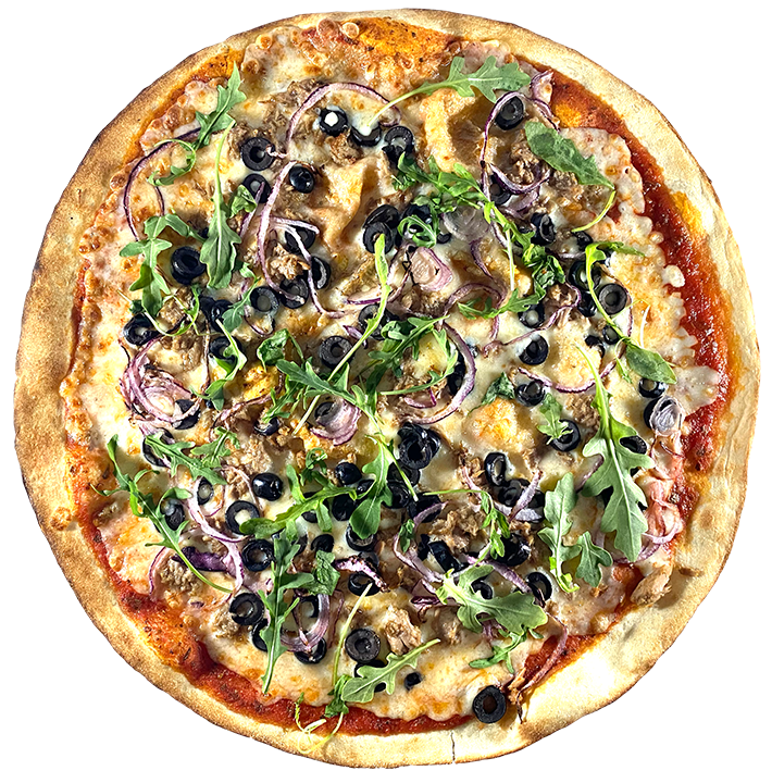 Ingr.: Tomate, Mozzarella pura, Atún, Cebolla, Aceitunas negras, Rúcula.