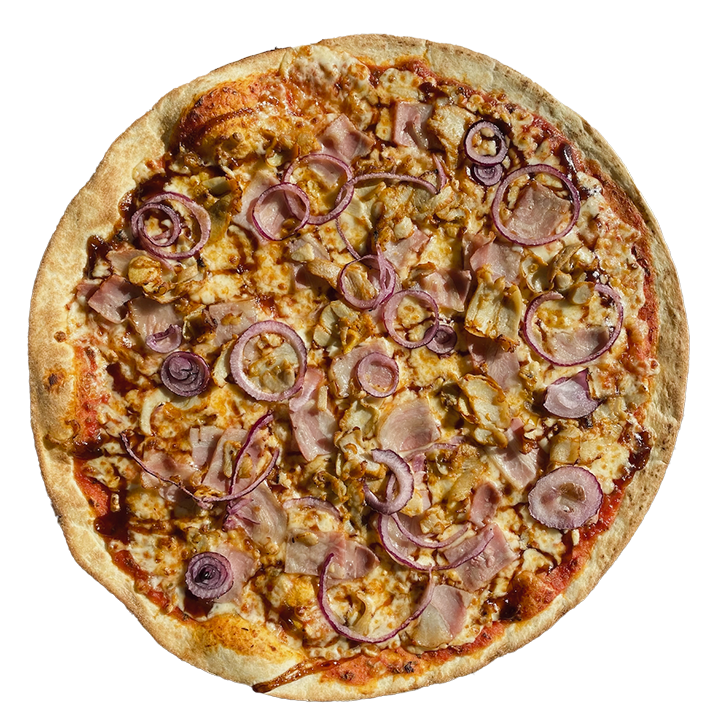 Ingr.: Tomate, Mozzarella pura, Salsa Barbacoa, Bacon, Pollo, Cebolla.